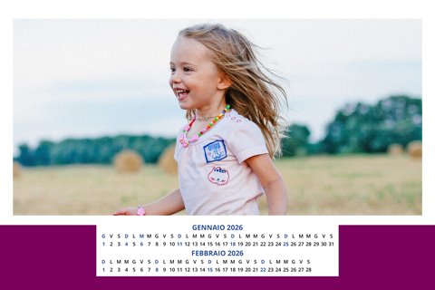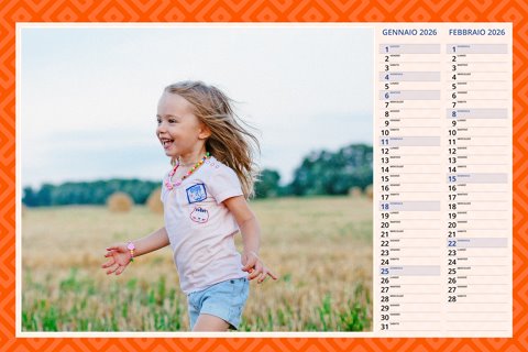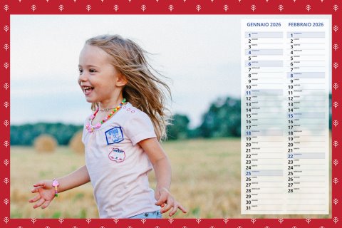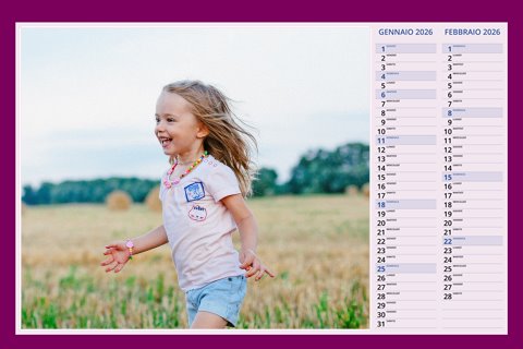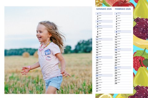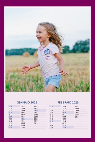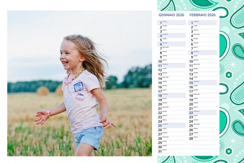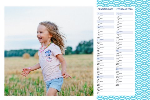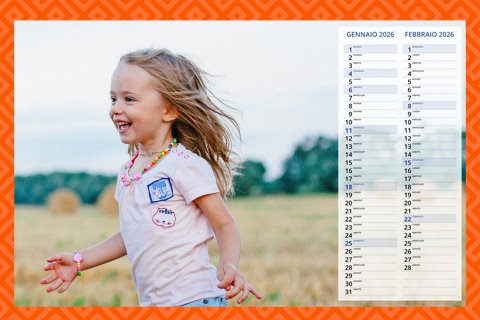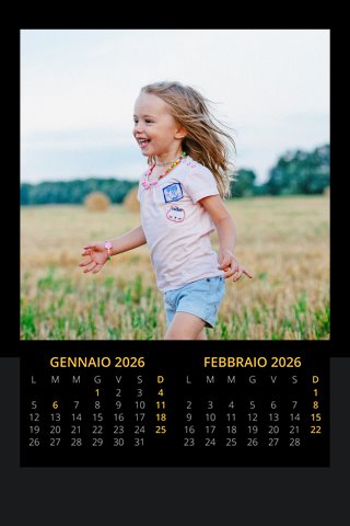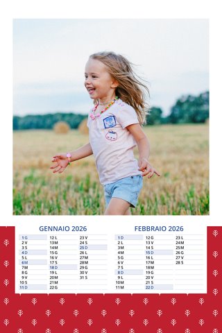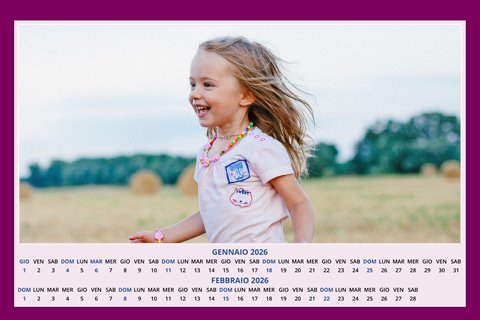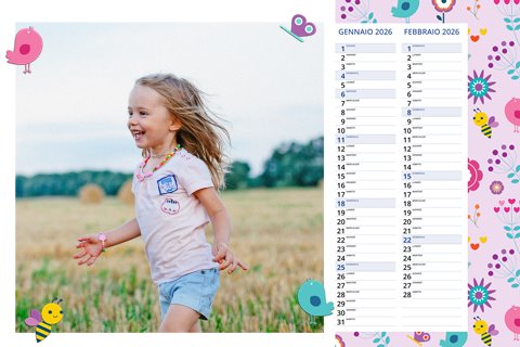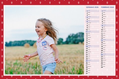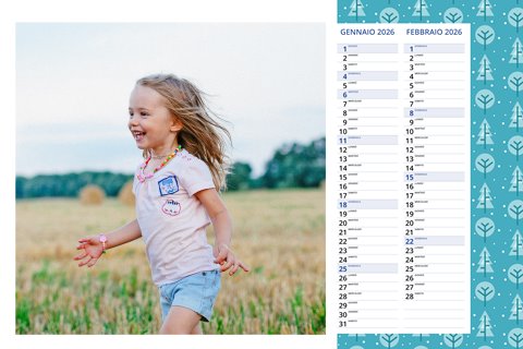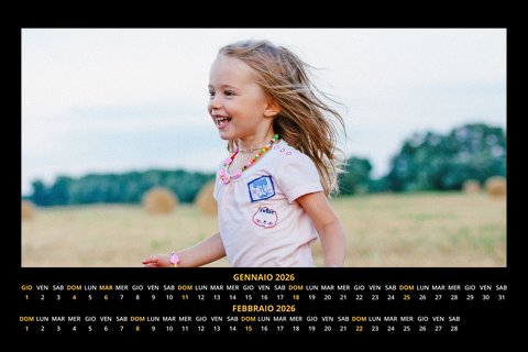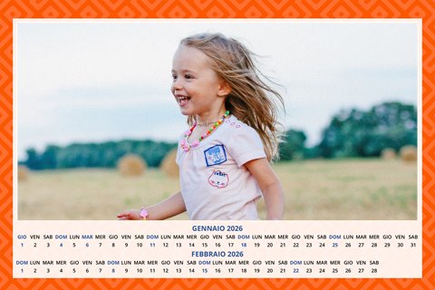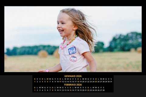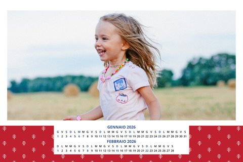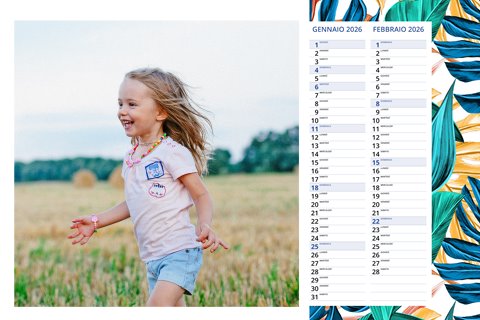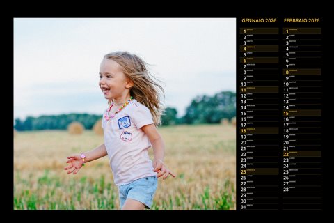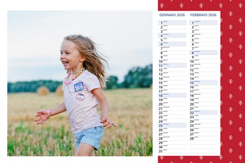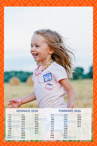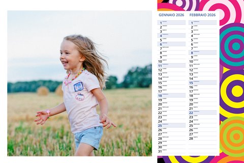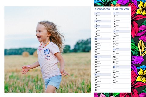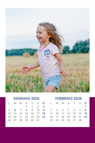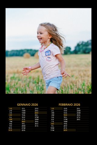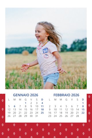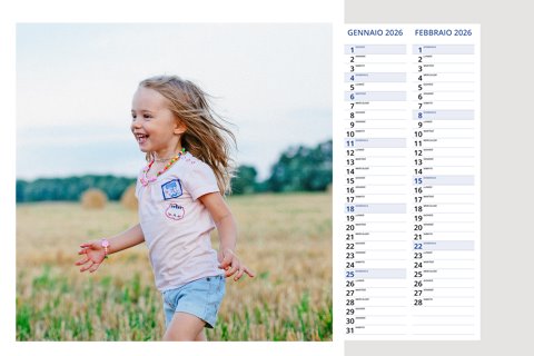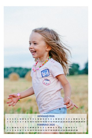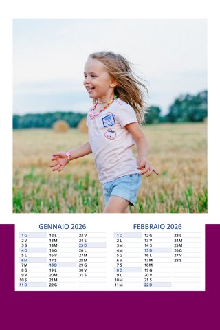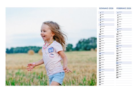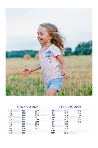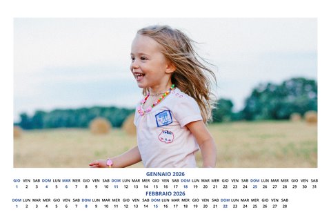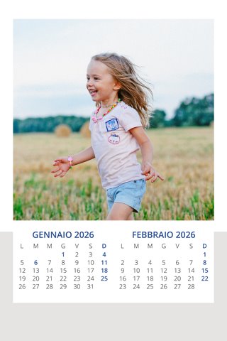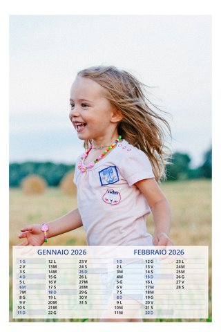 I Calendari Bimestrali sono stampati su carta fotografica; si compongono di 6 pagine, su ciascuna delle quali sono riportati due mesi. Sono necessarie 6 fotografie da inserire nelle raffinate grafiche offerte. Il posizionamento dell’immagine è determinante per la qualità del risultato finale: potrai modificare l’anteprima del tuo calendario, ed avere quindi il risultato più soddisfacente. E’ possibile effettuare questa operazione direttamente online.