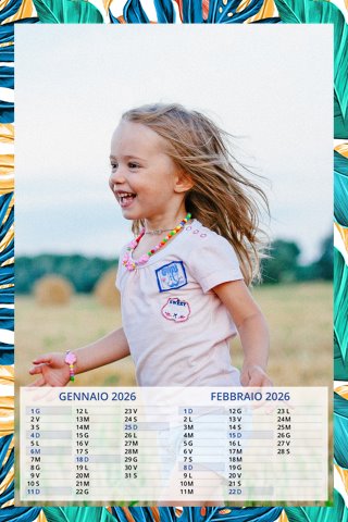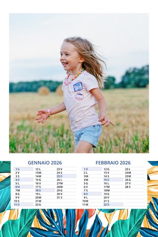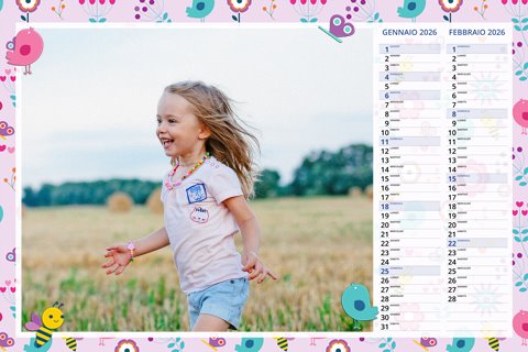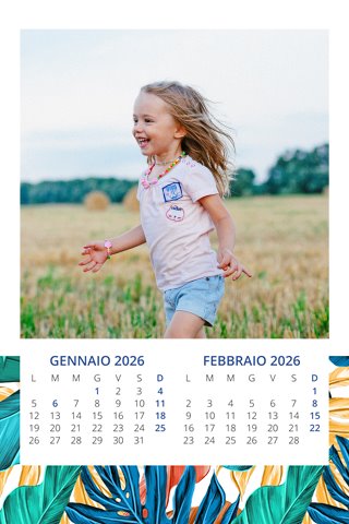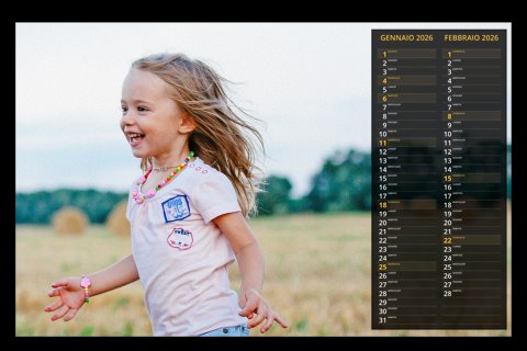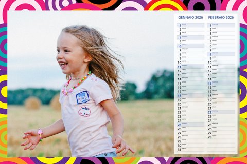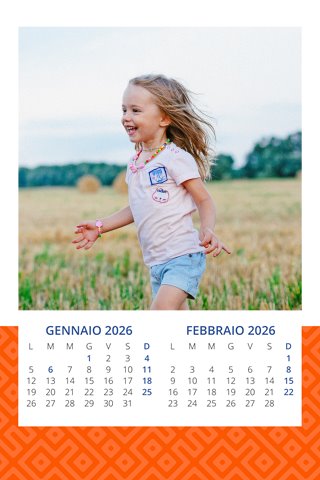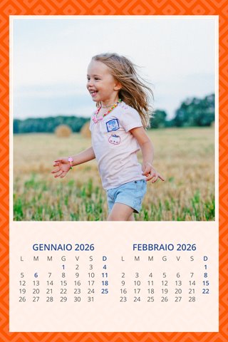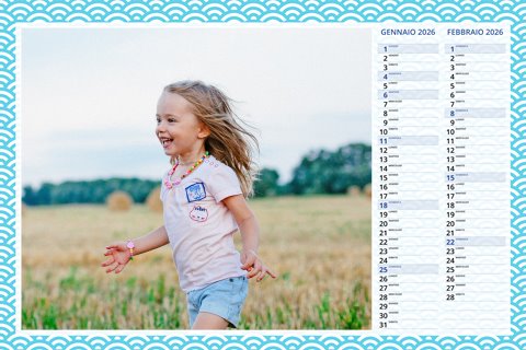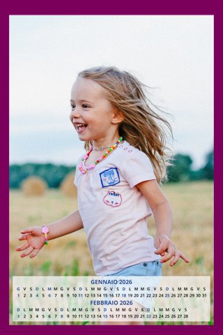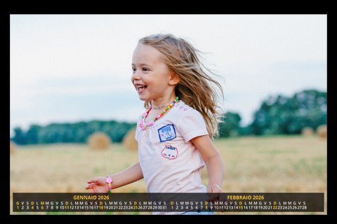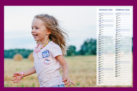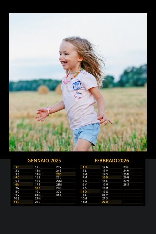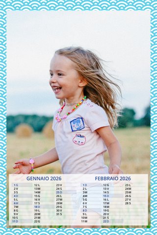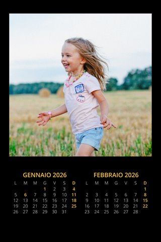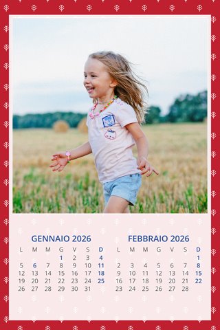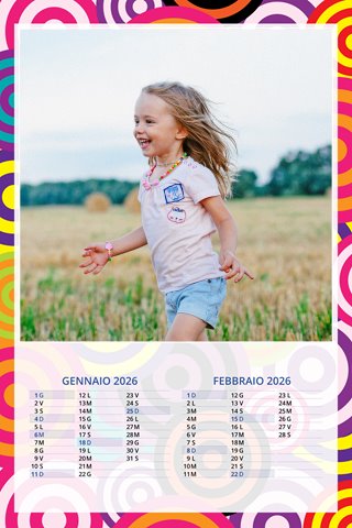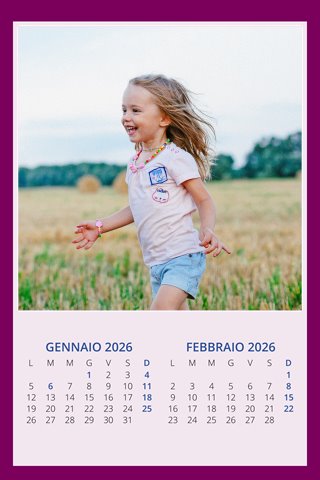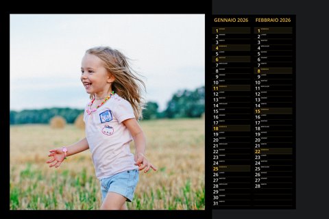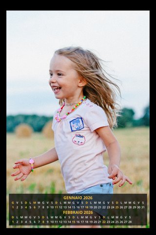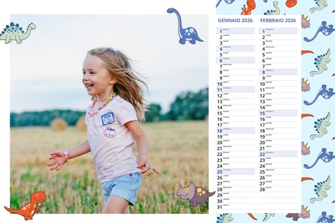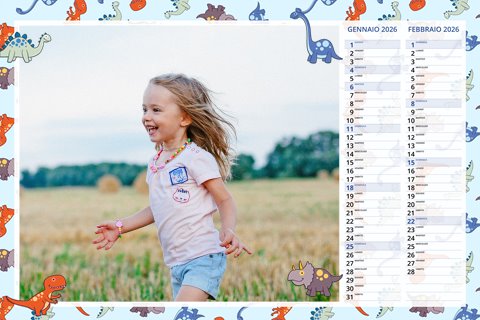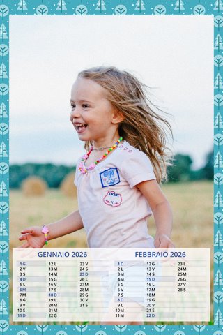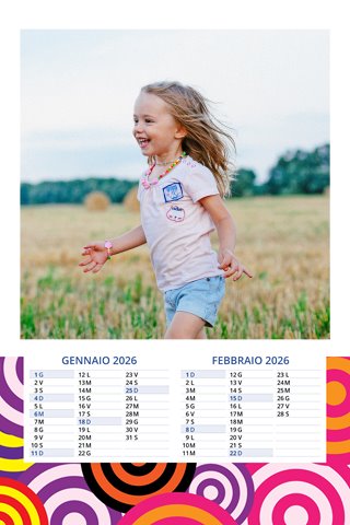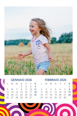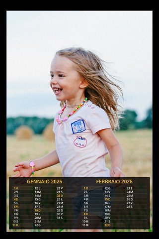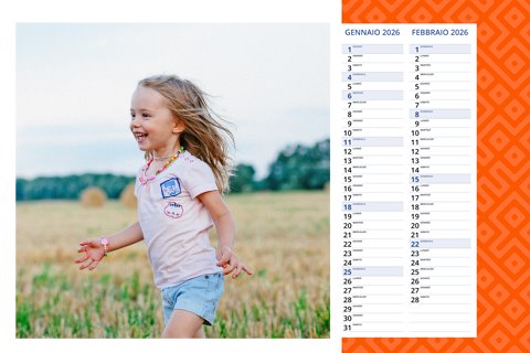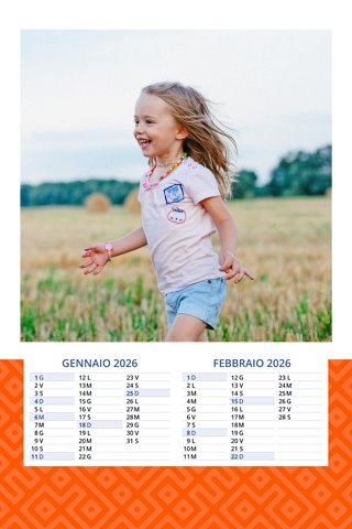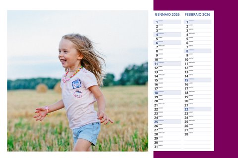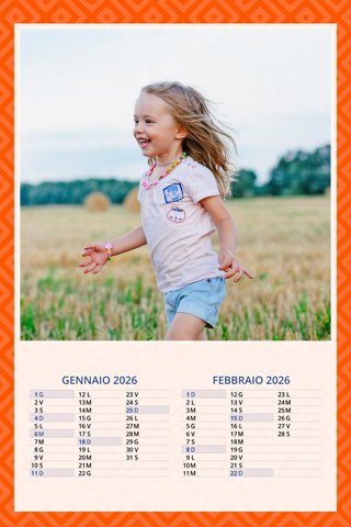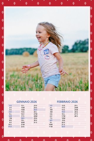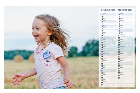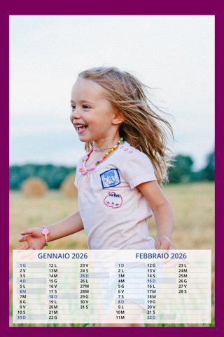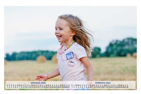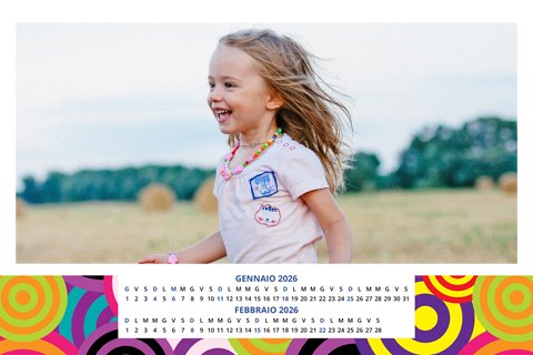 I Calendari Bimestrali sono stampati su carta fotografica; si compongono di 6 pagine, su ciascuna delle quali sono riportati due mesi. Sono necessarie 6 fotografie da inserire nelle raffinate grafiche offerte. Il posizionamento dell’immagine è determinante per la qualità del risultato finale: potrai modificare l’anteprima del tuo calendario, ed avere quindi il risultato più soddisfacente. E’ possibile effettuare questa operazione direttamente online.