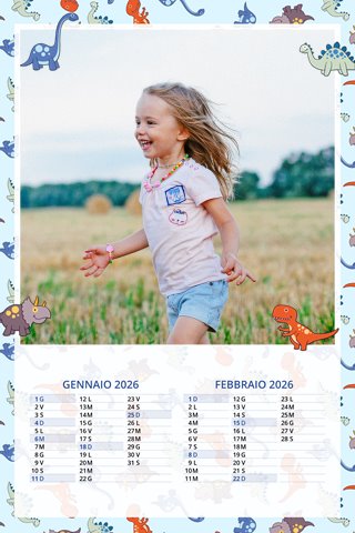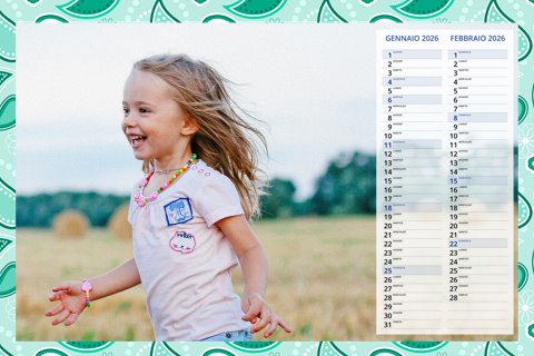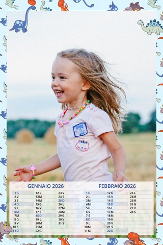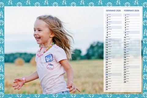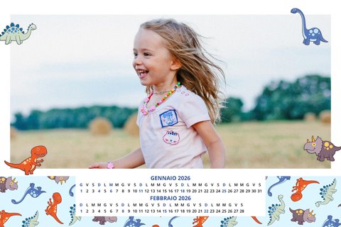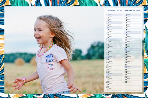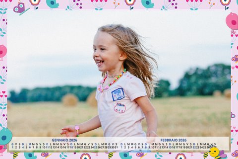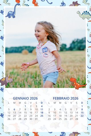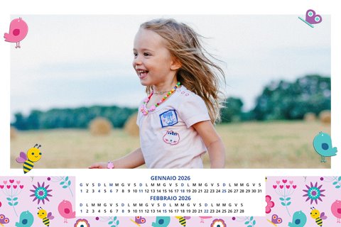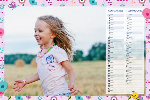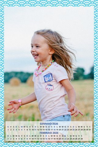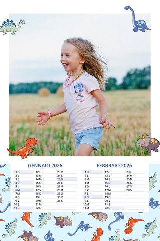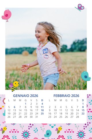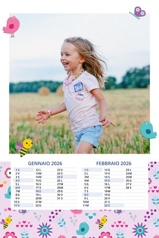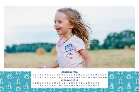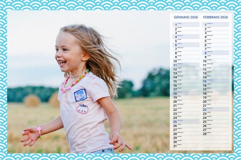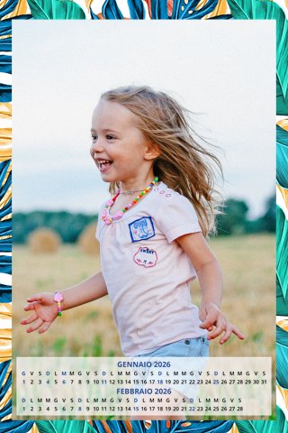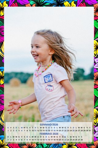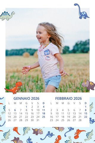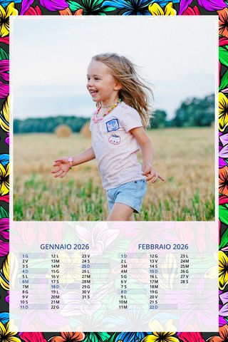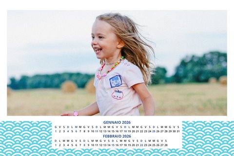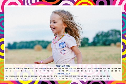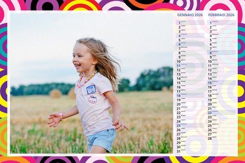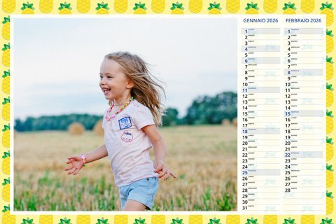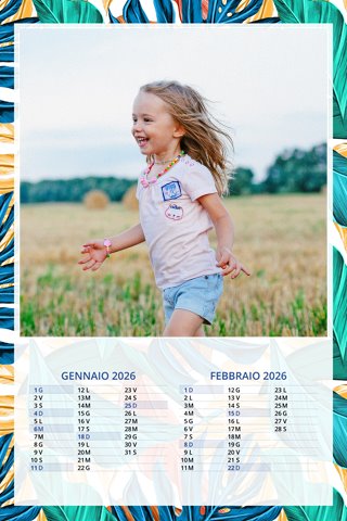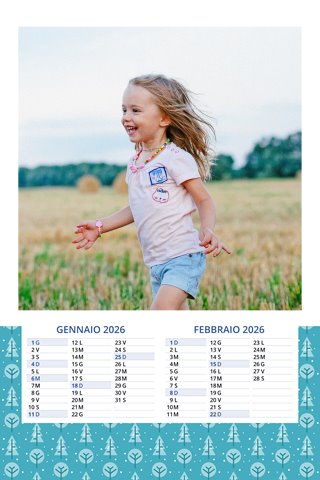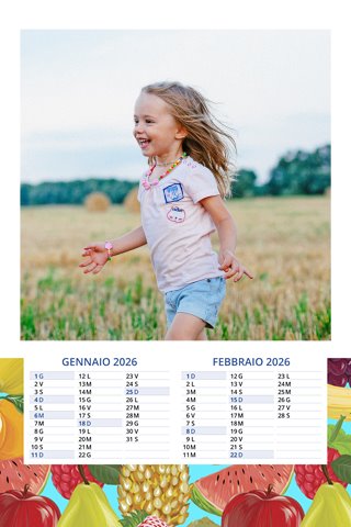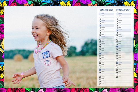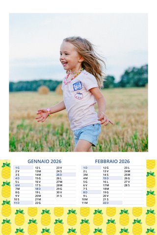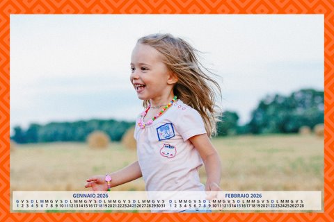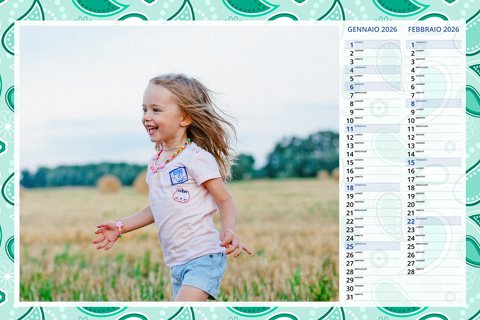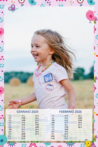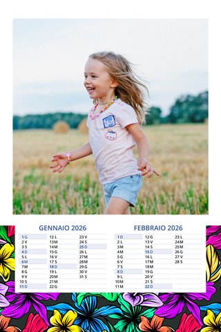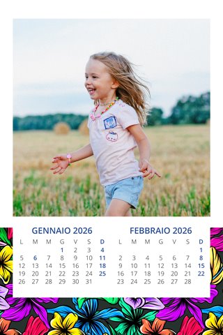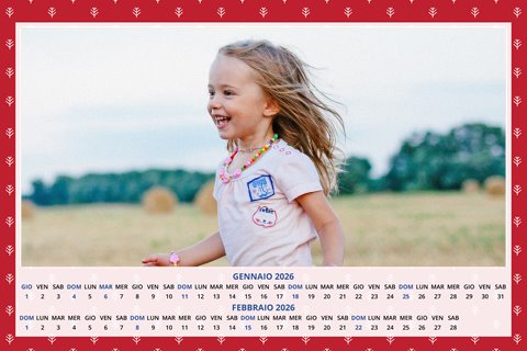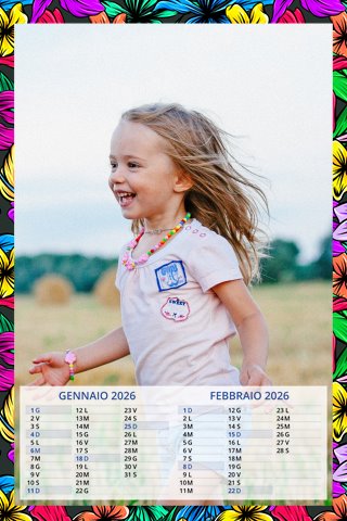 I Calendari Bimestrali sono stampati su carta fotografica; si compongono di 6 pagine, su ciascuna delle quali sono riportati due mesi. Sono necessarie 6 fotografie da inserire nelle raffinate grafiche offerte. Il posizionamento dell’immagine è determinante per la qualità del risultato finale: potrai modificare l’anteprima del tuo calendario, ed avere quindi il risultato più soddisfacente. E’ possibile effettuare questa operazione direttamente online.